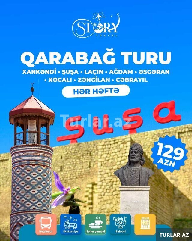 Şirkət99 Azn Xankəndi - Şuşa - Ağdam - Xocalı - Əsgəran turu Tarix : 27, 28 Sentyabr 4, 5, 11, 12 Oktyabr Qiymət: Ekonom paket: 44 azn. Standart paket: 49 azn. Qiymətə daxildir: Portal qeydiyyatı Nəqliyyat xidməti Ekskursiyalar Tur