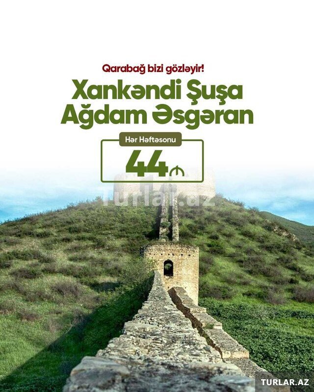 Şirkət44 Azn Xankəndi - Şuşa - Ağdam - Xocalı - Əsgəran turu Tarix : 27, 28 Sentyabr 4, 5, 11, 12 Oktyabr Qiymət: Ekonom paket: 44 azn. Standart paket: 49 azn. Qiymətə daxildir: Portal qeydiyyatı Nəqliyyat xidməti Ekskursiyalar Tur
