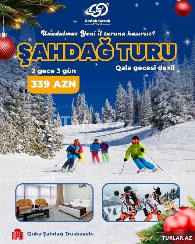 Şirkət25 Azn Unudulmaz Yeni il turuna hazırsız? O zaman Şəhərdən uzaqda məhz Qubada Şahdağ Otelində əsl yeni ili qarşılamaqa hazır olun Qiymət : 1 gecə 2 gün Qala gecəsi daxil 219 :AZN Tarix : 31-1 Yanvar+ Qala gecəsi daxil :