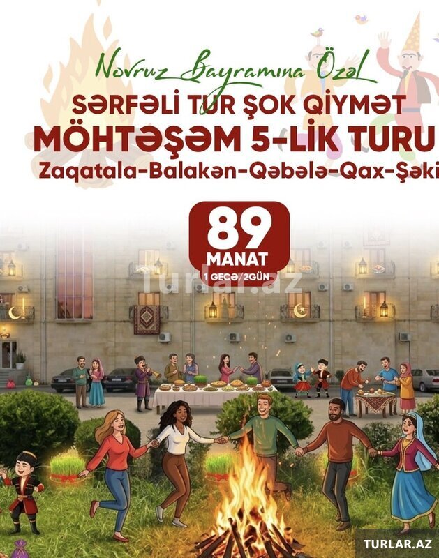 Şirkət99 Azn *Novruz bayramına özəl *Zaqatala - Qəbələ - Qax - Şəki turu •Turun tarixi: - 20-21 Mart (119₼/149₼) - 21-22 Mart (119₼/149₼) - 22-23 Mart (119₼/149₼) - 23-24 Mart (109₼/149₼) - 28-29 Mart (109₼/149₼) ✓Paketə daxildir: •