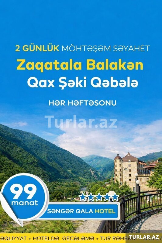 Şirkət139 Azn ~ Şəki Qəbələ turu •Tarix: 8, 9, 14, 15, 20, 21, 22, 23, 24, 25, 26, 27, 28, 29, 30 Mart •Qiymət: •Ekonom Paket: 28 azn •Standart Paket: 32 azn ✓Qiymətə daxildir: •Nəqliyyat xidməti •Ekskursiyalar •Səhər yeməyi